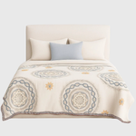 Dwustronny haftowany wzór nawiązuje do symetrii i geometrii tradycyjnych motywów mandali.